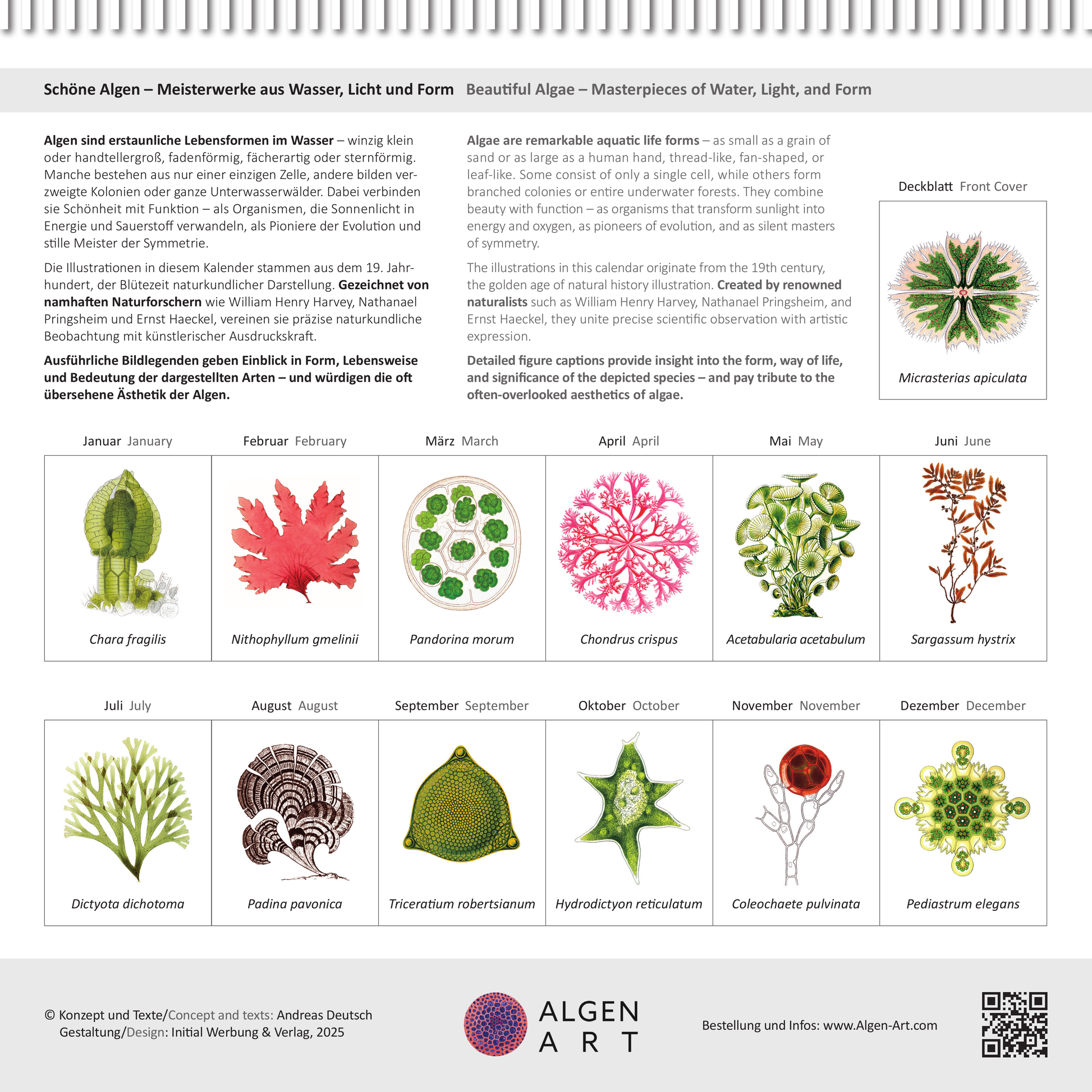 Ausführliche zweisprachige Bildlegenden (Deutsch und Englisch) bieten spannende Einblicke in Gestalt, Lebensweise und Bedeutung der dargestellten Algenarten – und rücken zugleich die oft übersehene Schönheit dieser bemerkenswerten Organismen ins Licht.